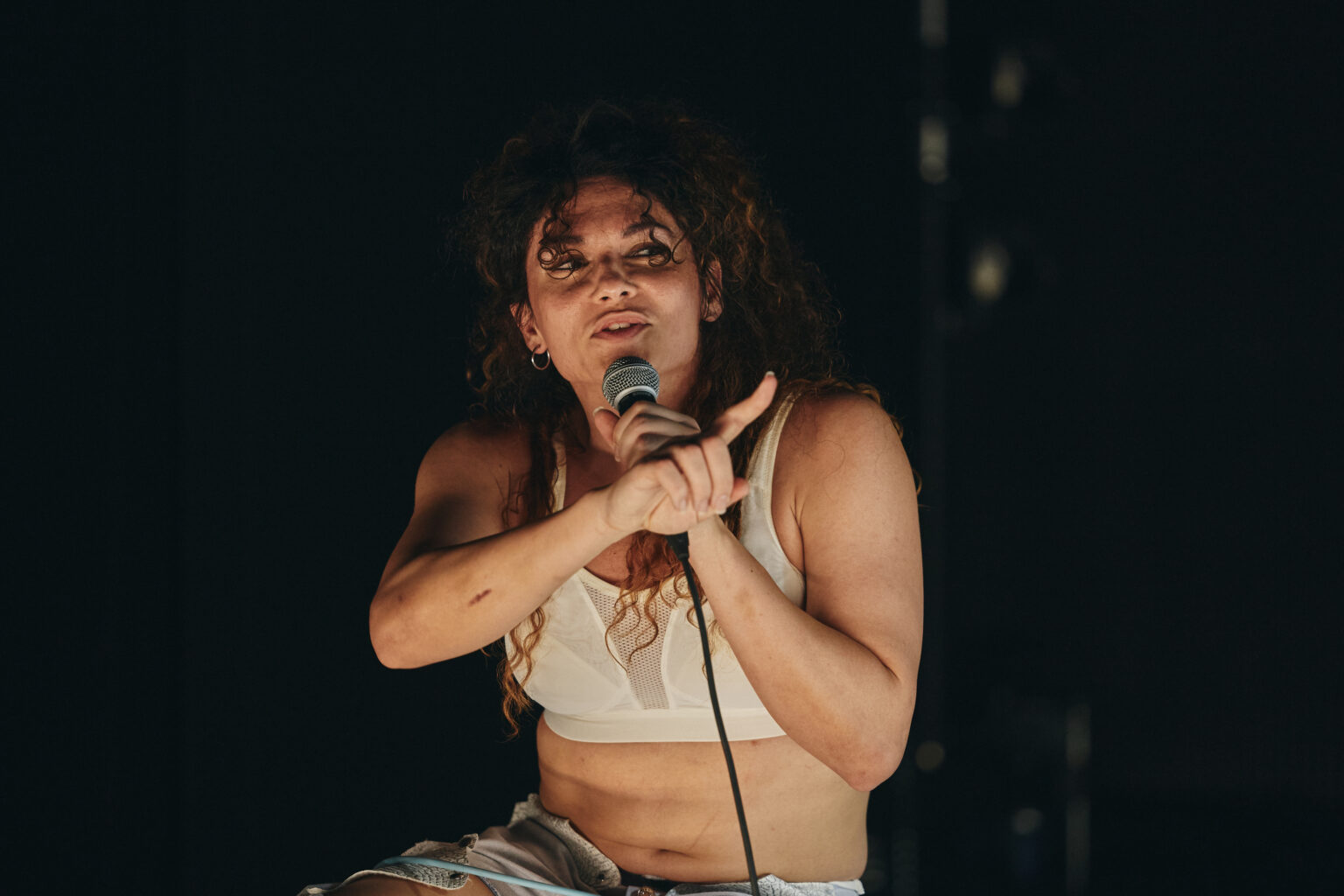 A Lisbon-based, Brazilian choreographer, dancer, and producer, de Medeiros also studied animated film. She spent nine years working with a Brazilian dance company before collaborating with several artists in Portugal. In 2021, she created her first piece, Atlas da Boca, followed by Baque in 2022. Her artistic research focuses on the interplay between movement, language, and affection. de Medeiros is also the founder of the Braba platform, which supports and funds projects initiated by, or centred around, the trans community.