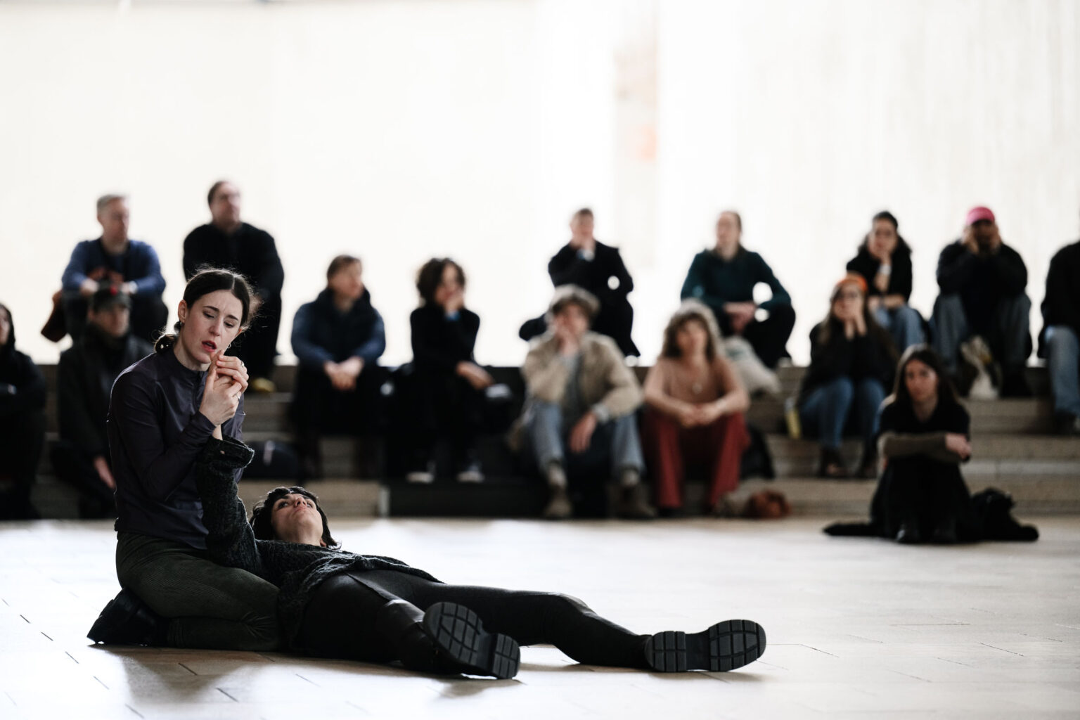 L’alliage entre des chants a capella, mélodies chuchotées, refrains pop, lamentos contemporains, airs mystiques, morphing vocal et des mouvements fluides étire le temps et l’espace, que le public partage avec les interprètes. Installé.e.s au sol sur des coussins, les spectateurs perçoivent intensément les vibrations chorégraphiques et vocales que dégagent les corps des performers. La physicalité de la danse, l’animalité des reptations, la beauté des tableaux vivants qui se forment et se défont, les expressions extatiques qui naissent sur les visages créent une dystopie mouvante, puissamment évocatrice de nos passions humaines. Dans le temps élastique de la représentation et grâce à l’impact sensoriel produit par la répétition des motifs dansés et chantés se tissent d’invisibles connexions qui conduisent jusqu’à une forme de transe. Libre à chacun de vivre l’expérience dans son intégralité ou partiellement.